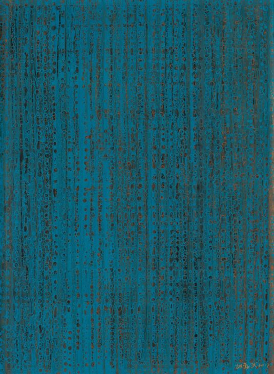 Largely considered an abstract artist, Hu uses grid, line, tone and mark to create his works. They are layered in colour through the meticulous placement of dots on a tight grid. The dots represent text which remains the underlying inspiration across all of his work and links his process to the ancient scholarly practices of calligraphy and ink painting.